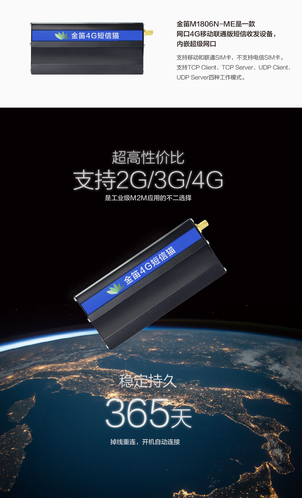 Jindi M1806N-ME é um dispositivo de envio e recebimento de SMS 4G de porta de rede, porta de super rede incorporada, suporte para cartão SIM móvel e Unicom, não suporta cartão SIM de telecomunicações. Ele suporta quatro modos de trabalho: Cliente TCP, Servidor TCP, Cliente UDP e Servidor UDP.